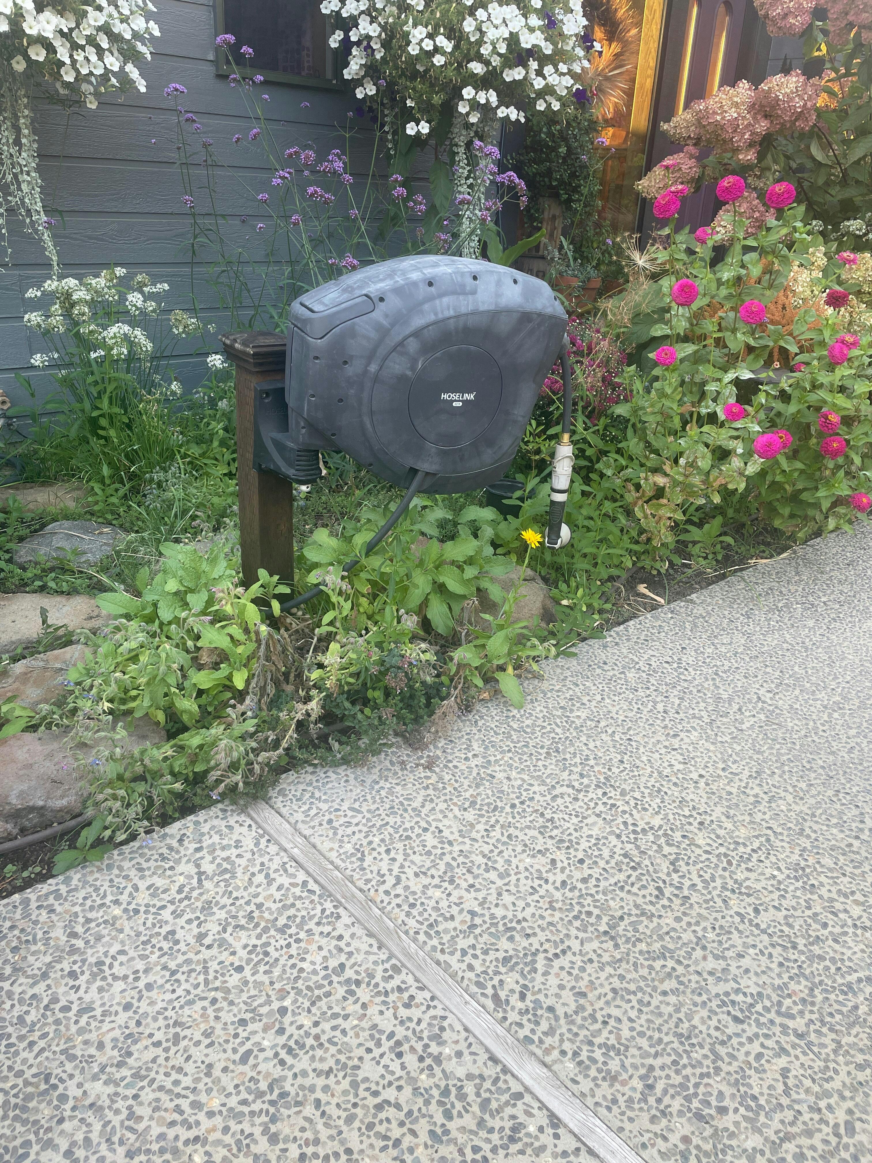 At a minimum, we recommend your post be installed at least 24” deep, with a 12” diameter for the concrete to provide enough resistance against the hose reel. If your soil is loose, you may consider preparing a deeper, wider hole for your post. Because our hose can be very heavy when filled with water and is cantilevered by design, always plan for a deep hole with adequate concrete.